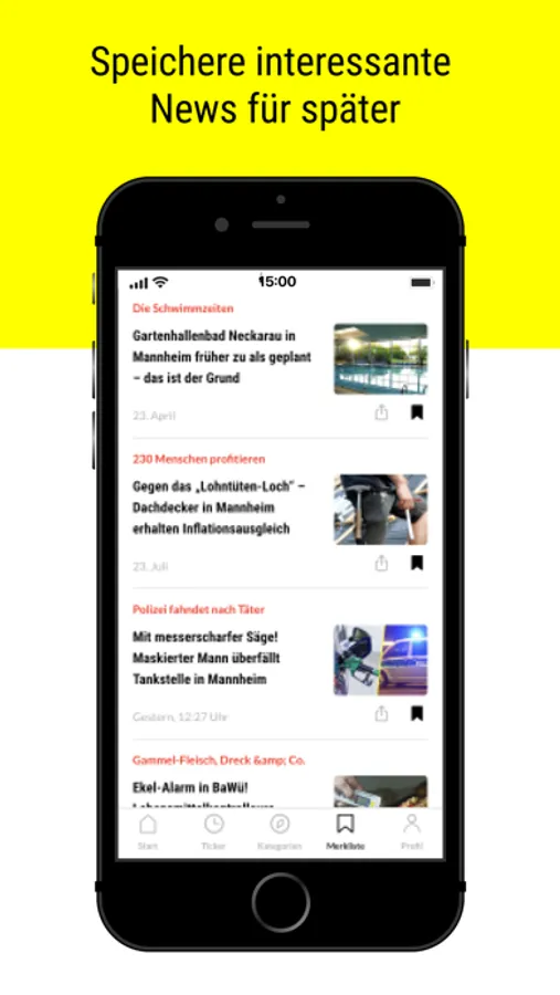 Mit der optionalen Push-Nachrichten-Funktion wirst Du über alle Neuigkeiten benachrichtigt. Außerdem kannst Du nun interessante Meldungen über die Bookmark-Funktion speichern und später in Deiner Merkliste abrufen sowie alle Artikel mit Deinen Freunden teilen.