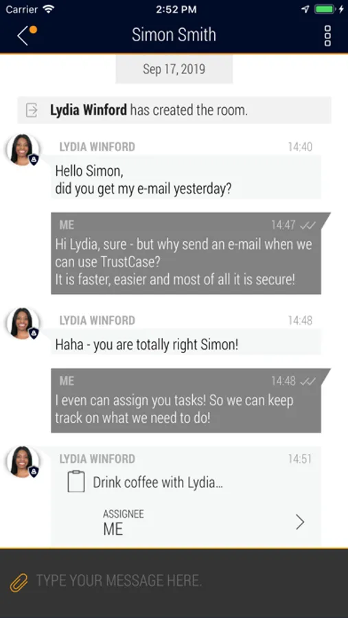 Fast, simple and end-to-end encrypted for complete peace of mind, TrustCase lets you do much more than simply send text messages. TrustCase gives you the tools to effectively manage teams in all situations. It allows you to create and delegate tasks and monitor what has already been done.
