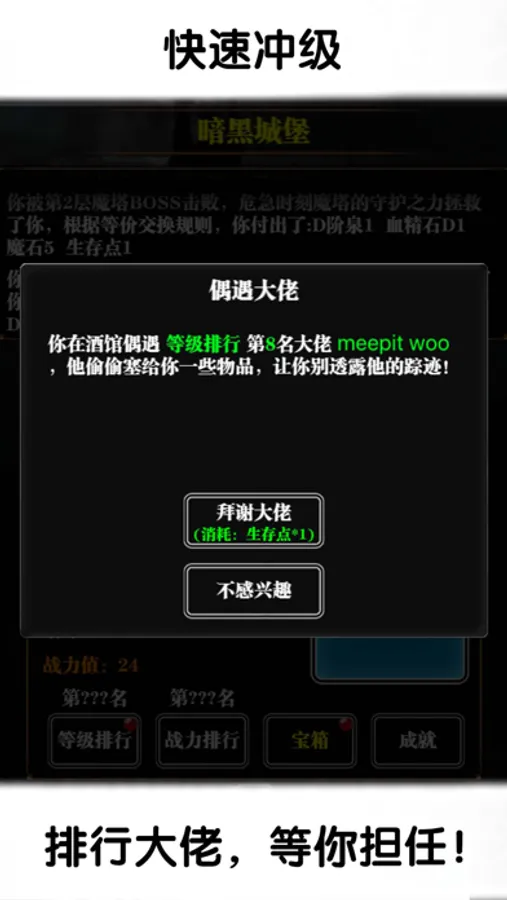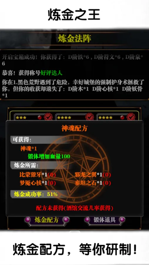 前期攻略:先去酒馆打工、点广告、交流(几率遇到获得配方魔石)积累材料炼金与锻体,也可以花魔石在酒馆交易用魔石换材料,属性提高到跟魔塔BOSS差不多就可以去冒险了,冒险看脸,秘境守护者有强有弱,打不过就靠回城术退出关卡吧。在酒馆点交流遇到事件,积累到魔石就去商城买获得炼金配方,然后炼金锻体提升自己的实力。不想冒险的,可以去城堡用生存点开宝箱,记得留一点生存点,不然打不过魔塔BOSS就只能重新开始了。记得每天的点下排行榜,触发大佬关怀事件。