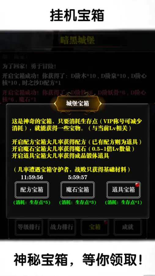可挂机式玩法,开启暗黑宝箱,获取魔石、配方!啊~遭遇守卫!快点击败它。