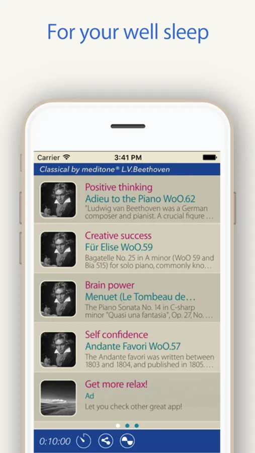 Furthermore, classical music has a long history and background of achieving various psychological benefits. Each tone includes an explanation regarding the specific composer and why each original piece produces that type of effect. This app can be used as a guide to classical music for people are hesitant about classical music and as an educational item for small children.