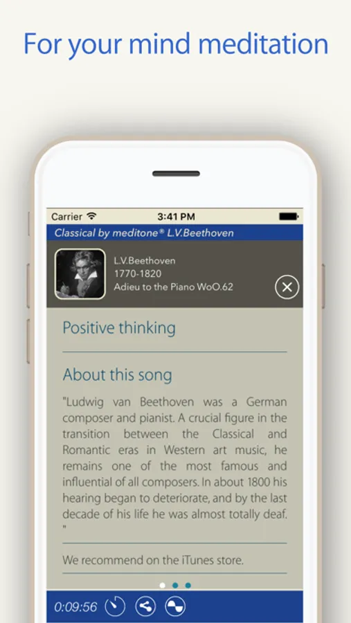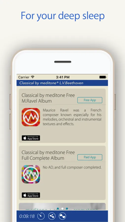 in ""SLEEP by meditone"" as well, the app achieves a relaxing effect that is equivalent to or greater than listening to classical music on a top class player.