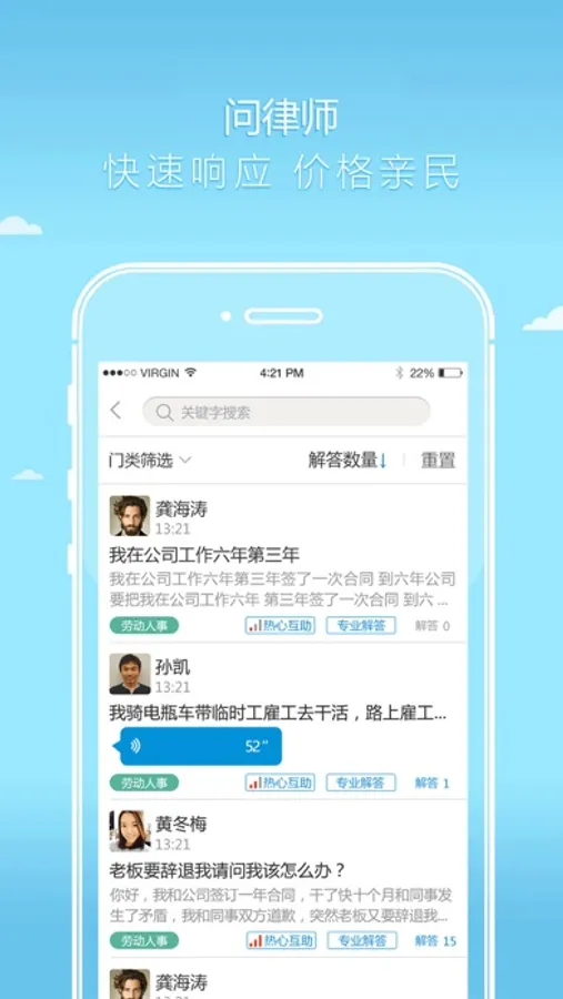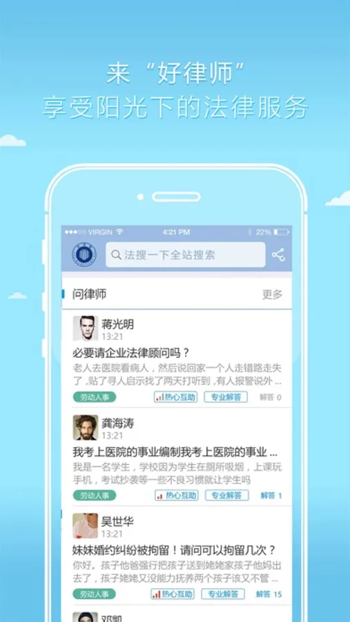 快速问律师 --用户在好律师网平台公开提问,由多名知名律师在线快速答复,提供在线律师服务;