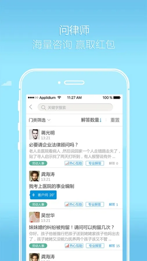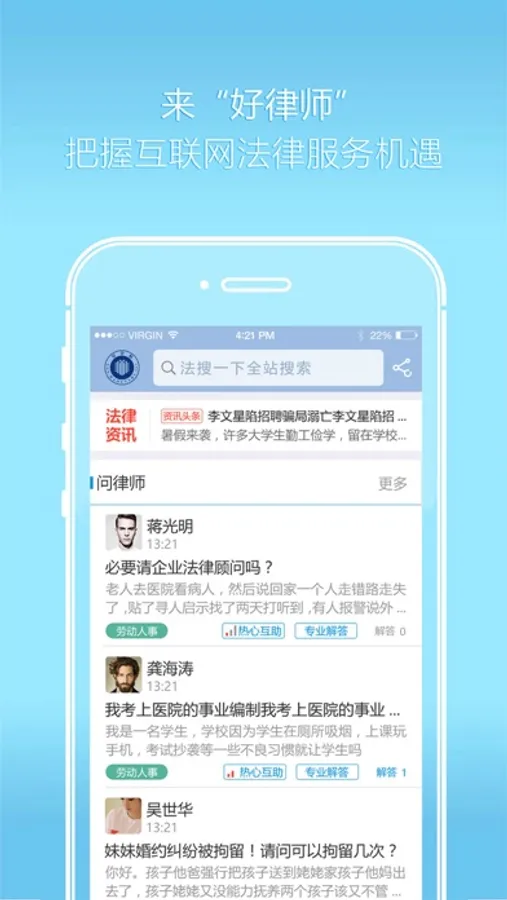 快速问律师 --用户在好律师网平台公开提问,由多名知名律师在线快速答复,提供在线律师服务;