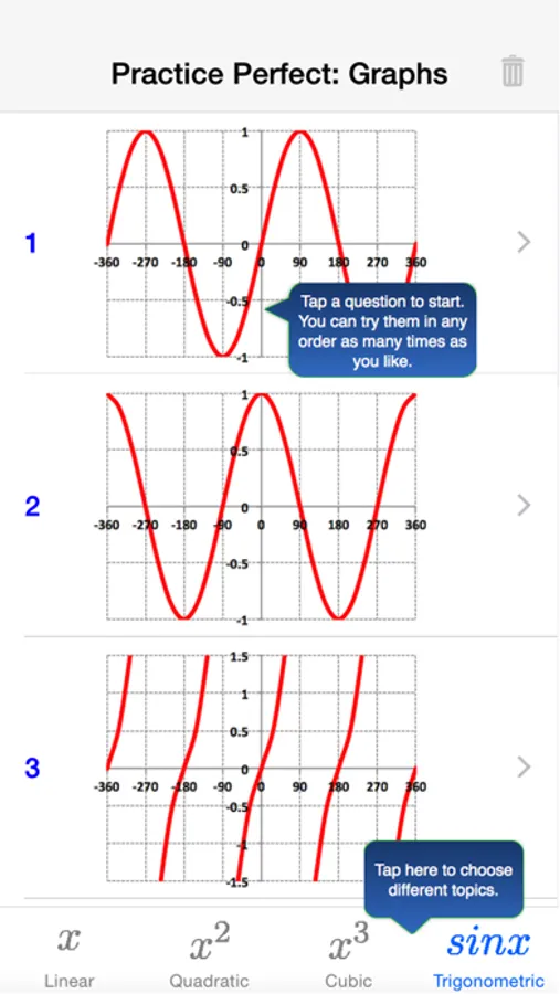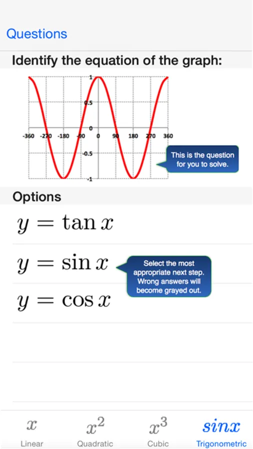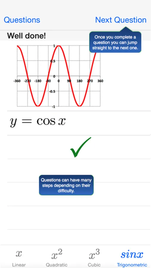 Boost your GCSE, A-Level or pre-University exam preparation. This app contains the following topics: Linear Graphs, Quadratic Graphs, Cubic Graphs and Trigonometric Graphs. 30 questions per topic.