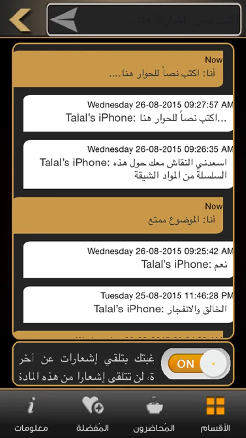يتمتع التطبيق بالمحادثات النصية الفورية المباشرة "تشات Instant Text Chat" مع ميزة وقف أو تفعيل وصول الإشعارات حول نقاش مادة معينة في حال عدم الرغبة في الاستمرار بالنقاش.