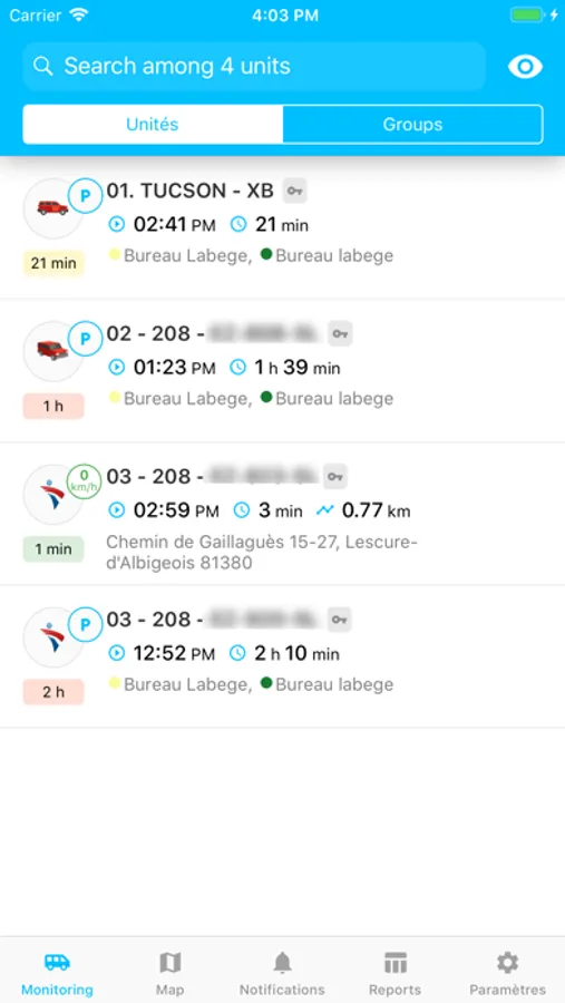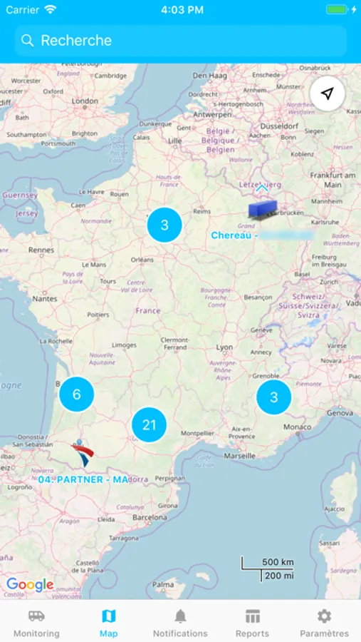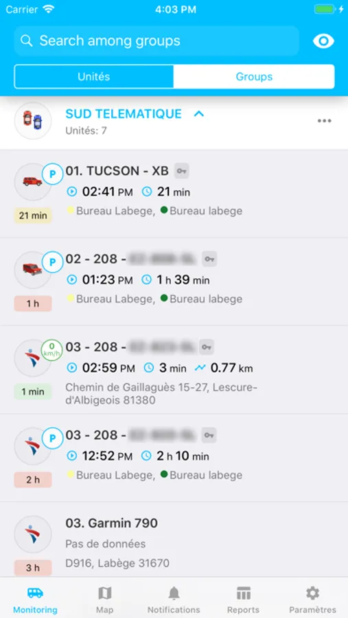 Vous pouvez retrouver dans Road Link Mobile vos zones et adresses clients ou fournisseurs, points d'intérêts, recevoir vos notifications et alertes en temps réel et accéder aux trajets individuels de chacun de vos véhicules ou aux trajets de vos groupes de véhicules.