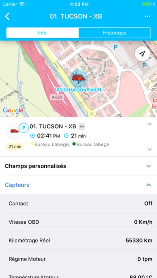 En temps réel comme en différé sur Road Link Mobile vous pouvez afficher les positions de vos véhicules ou objets connectés, les trrajets réalisés, les arrêts, les status de vos conducteurs ou véhicules et les valeurs des différents capteurs (température, contact, tachygraphe etc...)