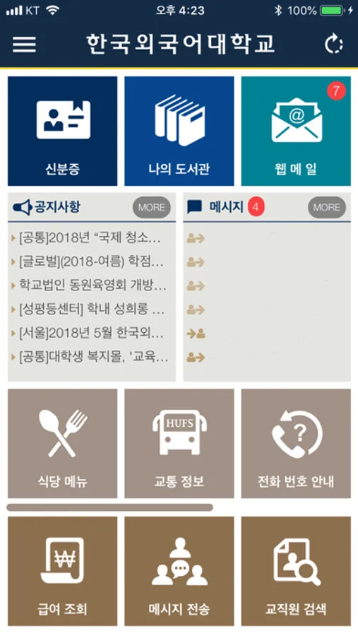 이 Hufs+ 앱은 한국외국어대학교 정보통신팀에서 학내 구성원들이 학교가 제공하던 정보화 서비스를 좀 더 쉽고 편하게 접할 수 있도록 직접 개발한 한국외국어대학교 공식 앱입니다.