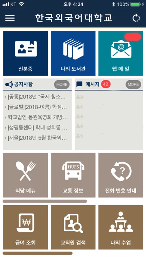 교원 서비스 : 출석 체크, 나의 수업(시간표, 학생 메시지 전송), 교직원 검색, 급여 조회, e-class, 외부연구, 훕스 콘텐츠