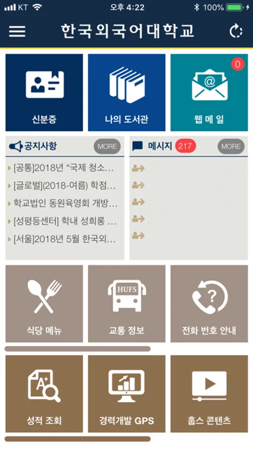 학생 서비스 : 출석 체크, 나의 수업(수업 시간표), 성적 조회, 경력개발 GPS, e-class, 훕스 콘텐츠