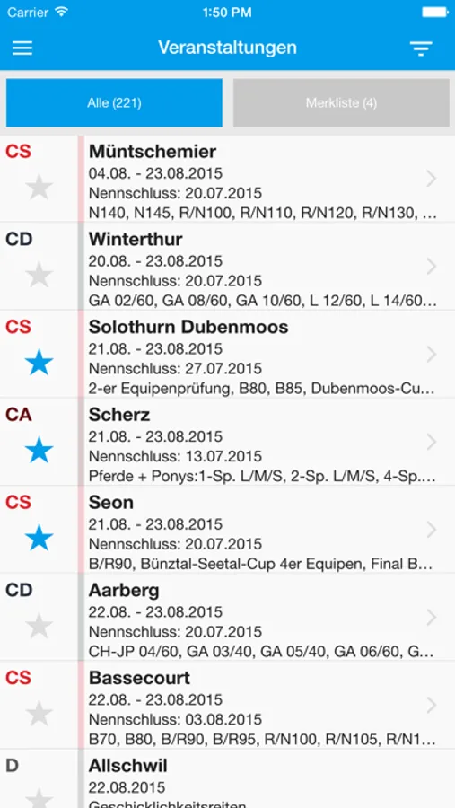 Suchen Sie nach Veranstaltungen und setzen Sie diese auf eine Merkliste. Dank einer Erinnerungsmeldung, werden Sie keinen Nennschluss mehr verpassen! Veranstaltungen mit laufender Nachnennphase werden rot angezeigt.