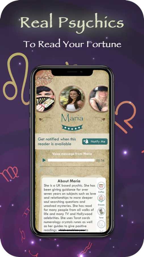 جميع البصارات وعلماء الفلك في التطبيق هم أشخاص حقيقيون، متخصّصون ويمتهنون علم قراءة الفنجان والتبصير، قراءة الكف, قراءة الوجه والفراسة، تفسير الأحلام، فتح ورق التاروت، طلب إستشارة عاطفية ومعرفة أبراجكم اليومية.