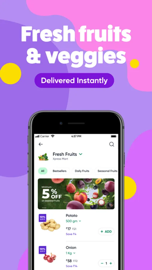 Order the freshest Fruits & Vegetables from local stores near you using this online delivery app. Now shopping for Fruits & Vegetables is so easy; just place an order on the app, & get it home delivered instantly.
