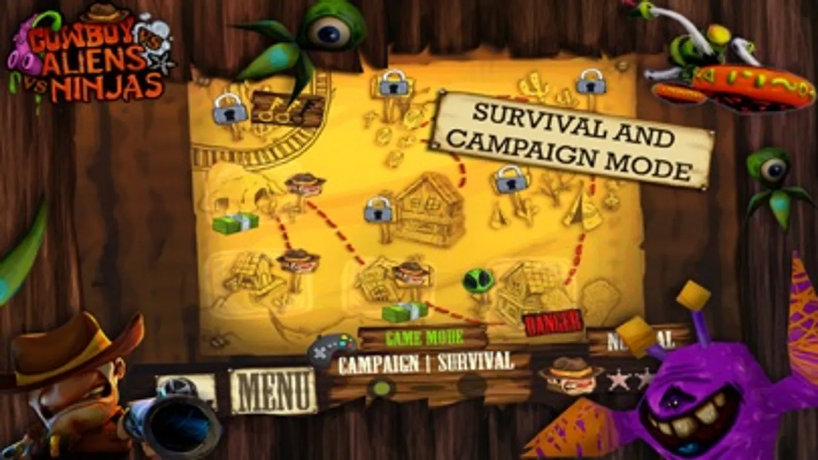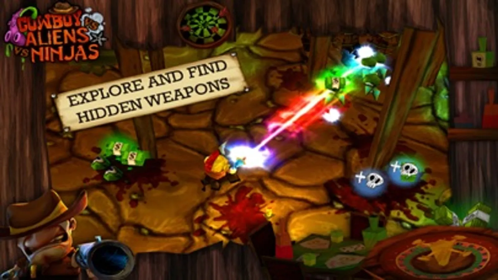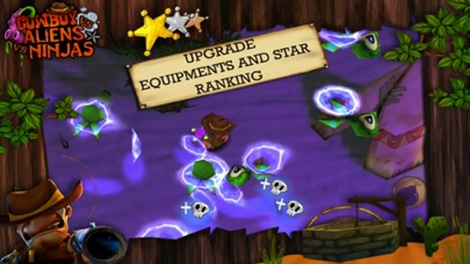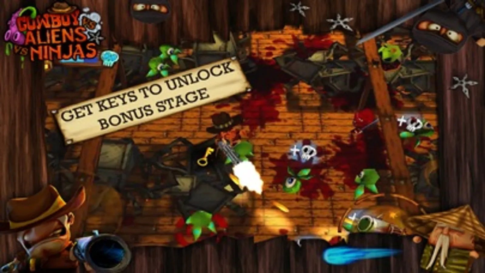 Please, note that "Cowboy vs. Ninjas vs. Aliens" isn't your average cowboy game. In this game you fight aliens (Cowboy vs. Aliens!) and ninjas (Cowboy vs. Ninjas!). But you will not fight zombies (Cowboy vs. Zombies) on this version. :(