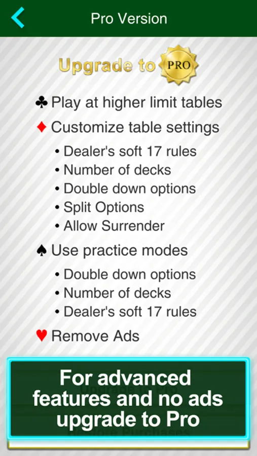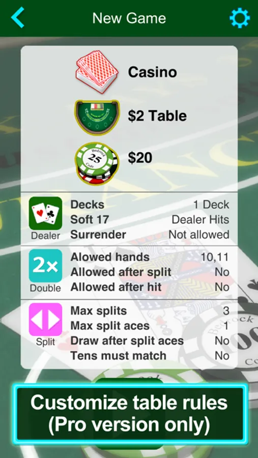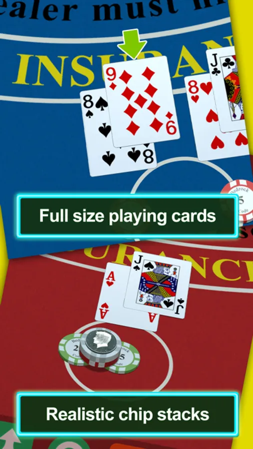 BC Blackjack features realistic full sized cards, chips and blackjack table, so no more squinting at tiny cards like in other Blackjack apps. But the realism does not stop there: BC Blackjack stacks chips, deals cards, pays and collects bets just like in the casino. Pro users can customize the table rules to match their favorite casino.