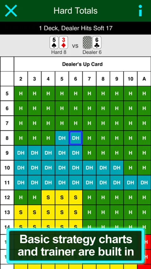 BC Blackjack has a built in trainer and basic strategy charts to help you learn and practice basic strategy. Your play history is also kept so you can easily see how you are doing. Pro users can use three practice modes to improve areas of weakness.