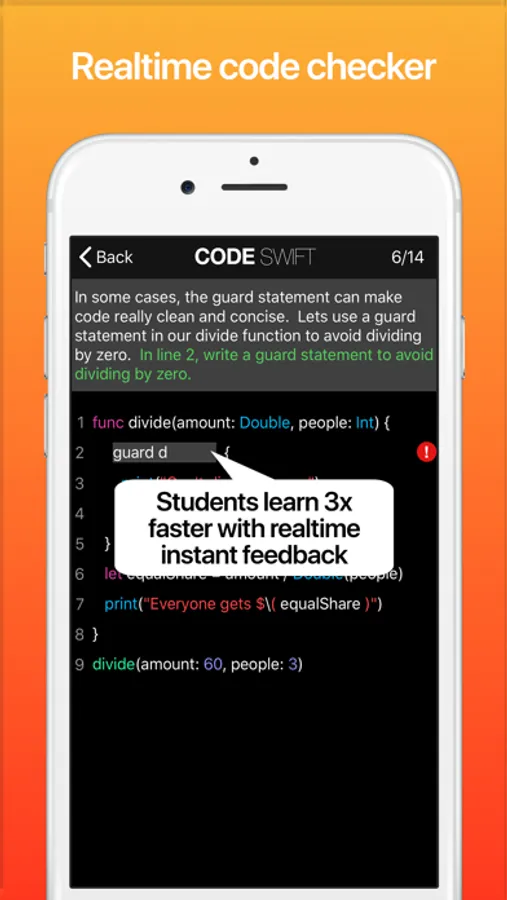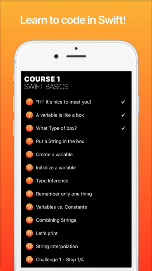 Code Swift offers a totally unique experience by challenging you to write your own code from start to finish. There really is no faster and more enjoyable way to learn than writing your own code. Our realtime code checker instantly offers valuable tips and suggestions the moment you make a mistake. It is like having your own personal swift instructor sitting next to you to help you along and accelerate your learning and make sure that you won’t get frustrated, stuck, and give up.