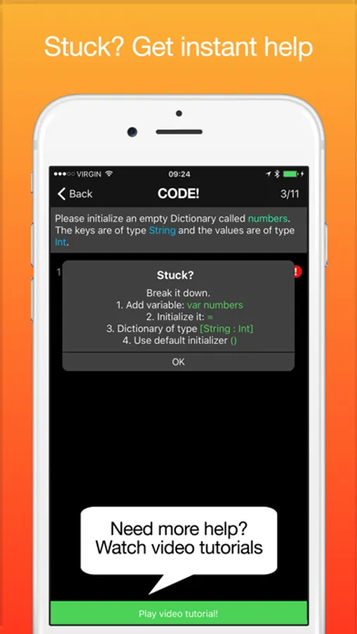 Afraid of getting stuck? Don't be! As soon as you make a mistake, you see a red exclamation mark. Just press on it to get step by step guidance and help so you are never stuck and never alone! Once you get more comfortable, you can also turn the real-time code checker off (this is great while working through the course a second time to make sure you truly know how to code).