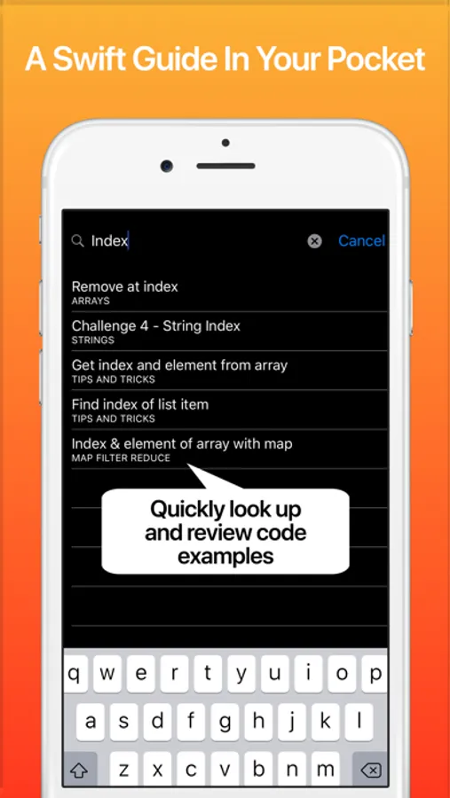 Code Swift also acts as a Swift Guide in your pocket. Have a question or need a quick refersher on a specific topic? Just use our powerful search feature to instantly find great examples and code snippets with detailed explanations.