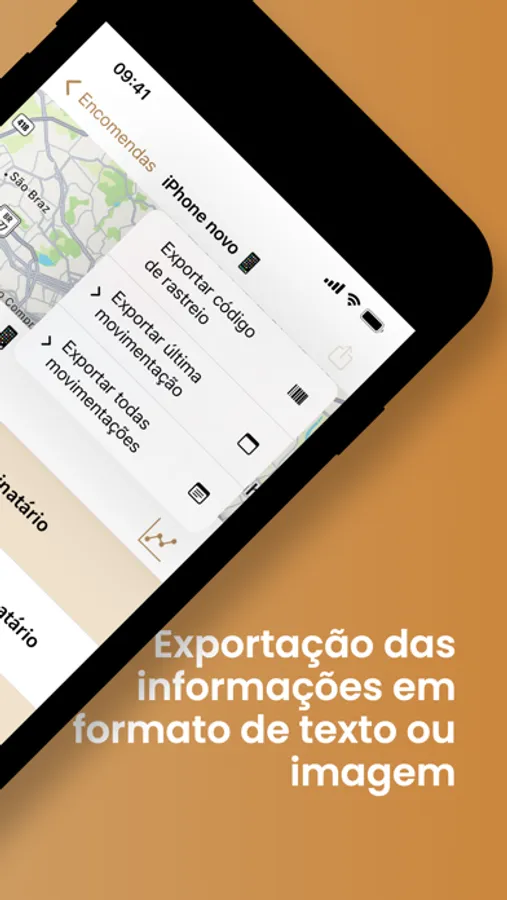 • Exportação de código de rastreio e movimentações para fácil compartilhamento