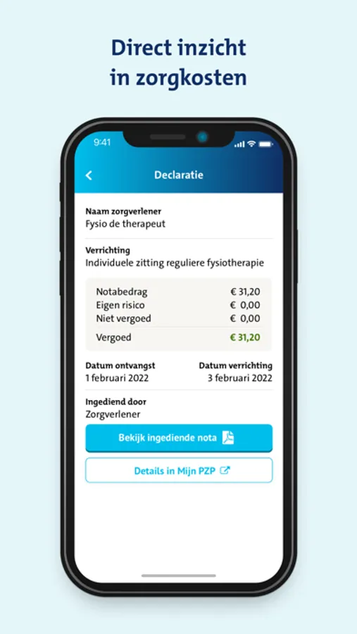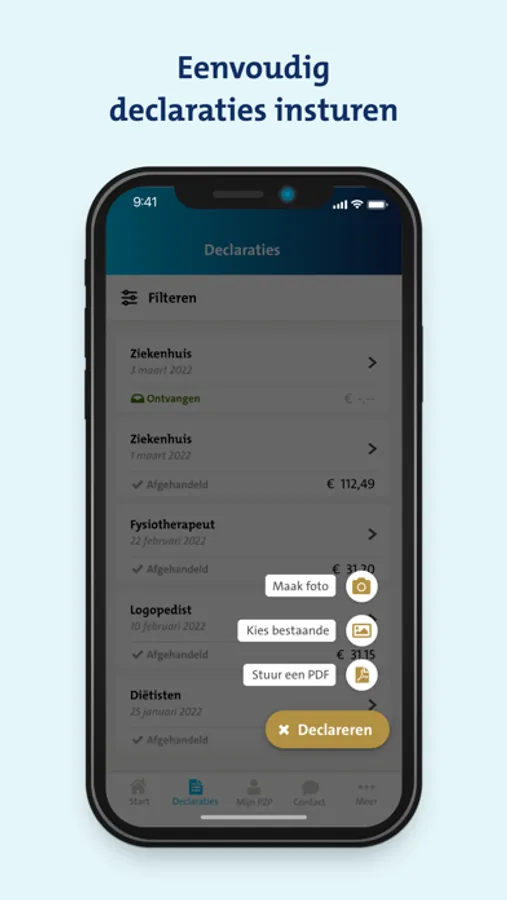 Received an invoice from your healthcare provider? Claim your invoice in a few simple steps. Simply send us a photo or pdf of your invoice. We take care of the rest. Need more info about your health insurance or healthcare consumption? Find the answer in the app! With your smartphone, wherever and whenever you want.