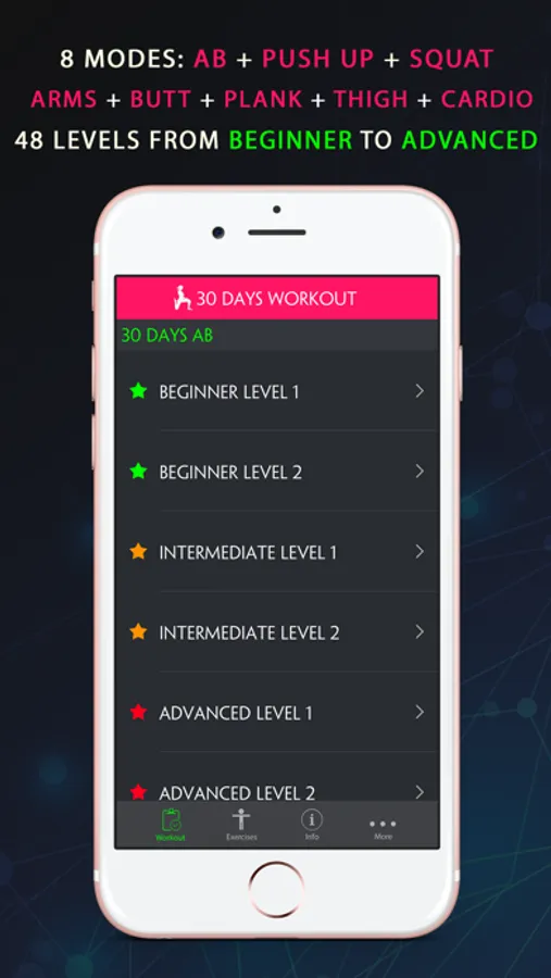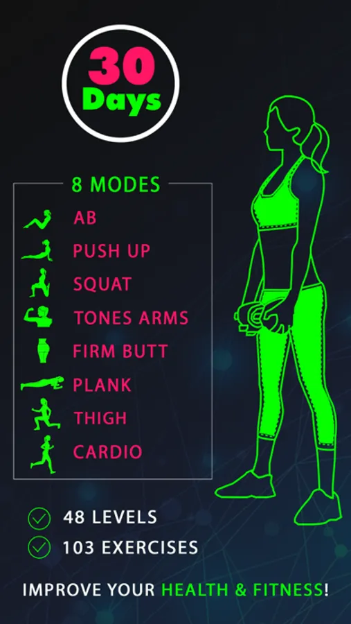 • 8 workout categories: 30 Day Ab, 30 Day Push Up, 30 Day Squat, 30 Day Toned Arms, 30 Day Plank, 30 Day Thigh Slimming, 30 Day Cardio