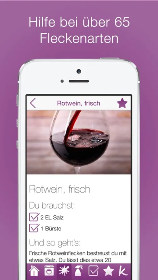Egal, ob sich es um die sichtbaren Spuren von Rotwein, Obst, fettige Saucen oder Kugelschreiber handelt, in dieser App findest du viele tolle Fleck-Weg-Zaubermittel, mit denen du selbst hartnäckigen Flecken ohne Chemiekeulen zu Leibe rückst.