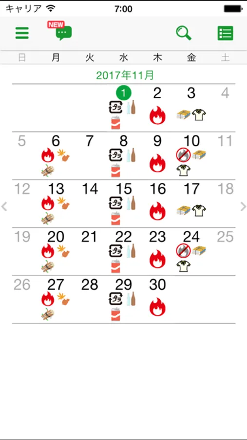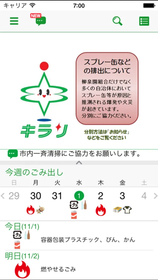 収集日変更のお知らせやイベント情報などを確認することができます。