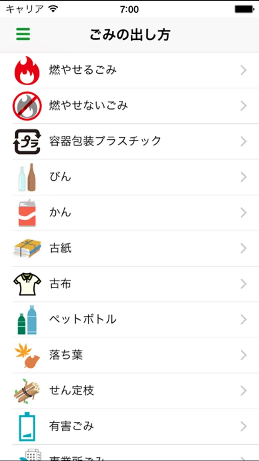 ごみの種別ごとに、主な品目と出し方を確認することができます。