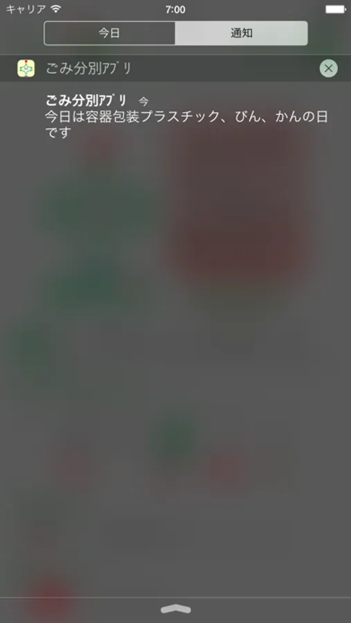 収集予定のごみ種別を前日と当日にアラートでお知らせします。時間は自由に設定することができます。