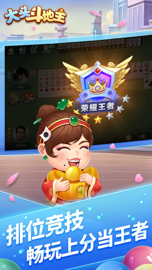 每个赛季,分别有青铜,白银,黄金,铂金,钻石,星耀,王者七个段位,一口气升上王者,你敢来挑战吗?大头斗地主全新排位玩法,除胜利可以升星外,打出的炸弹分越多,连胜越多,还可额外升星!更有多种技能供你选择,如记牌器,超级加倍,连胜符,升星加成等,上王者,很简单。