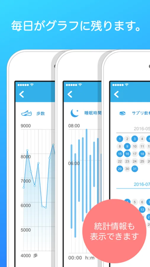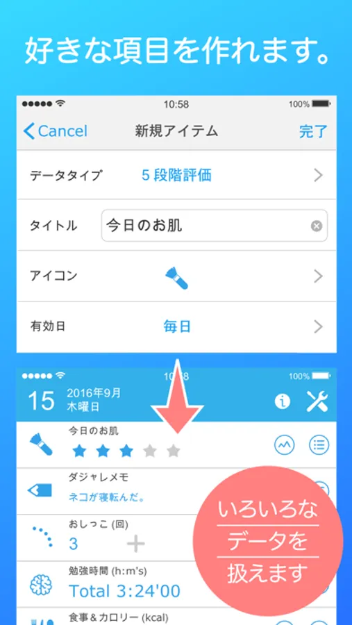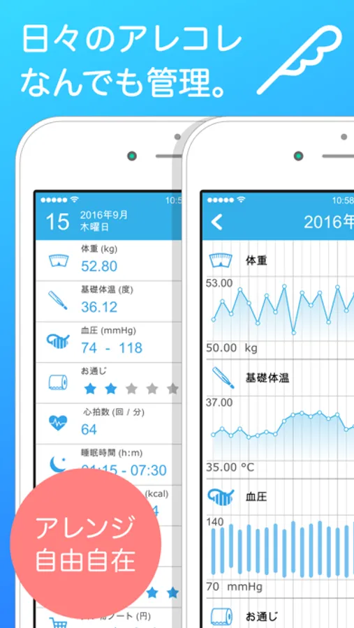 毎日の様々な情報・出来事をカンタンに管理できます。体重、体脂肪率、血圧、睡眠時間、体温、お通じ、腹筋回数などなど、必要なものを好きなように残せます。操作はシンプルです。たくさんのデータを管理していても、数秒あれば「アプリを立ち上げ、データを入力し、アプリを閉じる」ことができます。ダイエット・生活習慣の管理や習慣化はもちろん、いろいろな「じぶん管理」にご活用ください。