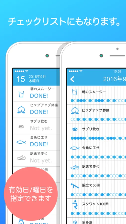 チェックボックスを簡単に作れます。毎日のタスク管理に便利です。全てのデータに「有効日/曜日」の指定が可能ですから、一週間を通してのタスク管理にも活躍します(指定したデータは対象日にのみ表示されます)。