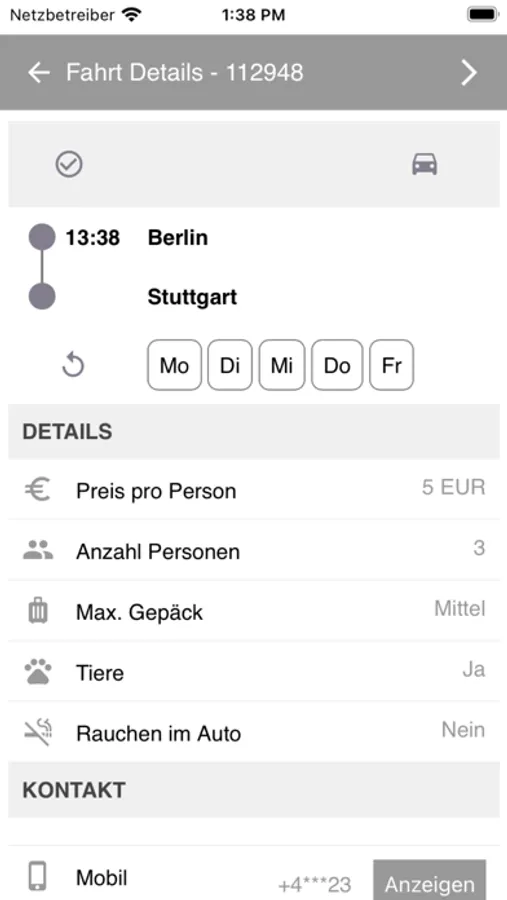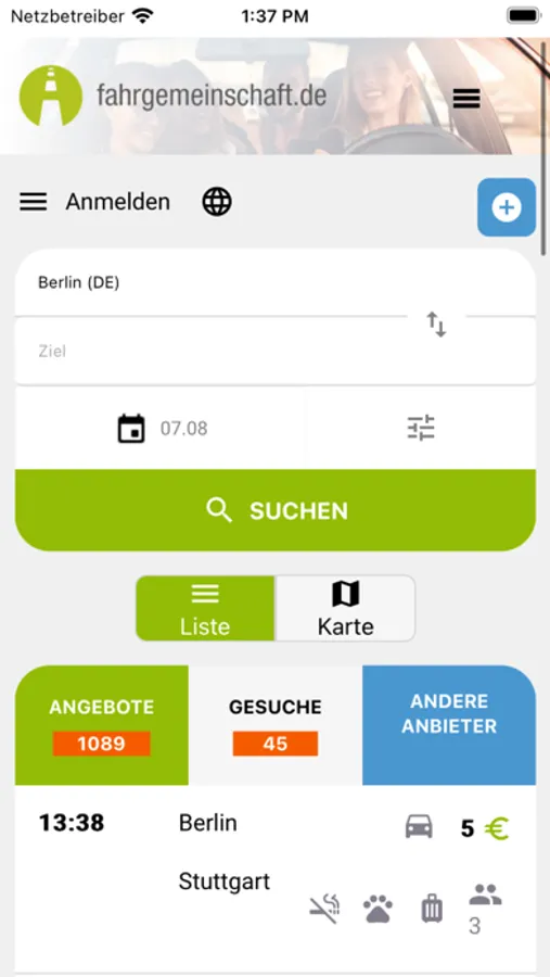 - optionale Hinweise/ Filterfunktionen zu Gepäckgröße, Geschlecht der Mitfahrer, Transport von Tieren, Raucher-/Nichtraucherfahrt