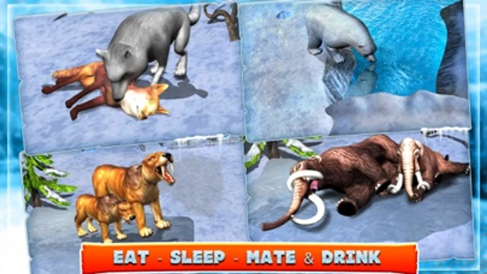 But seriously, ever played as an Ice Age animal? Grow the tusks of a Mammoth, the fangs of a Saber Tooth Tiger, and the fur of an ancient Grey Wolf and Bear. Here is your chance to play as your favorite Ice Age beast and fight like an angry, ferocious predator! Attack and knock down dinosaurs and minotaurs, the barbarians who are after your family.