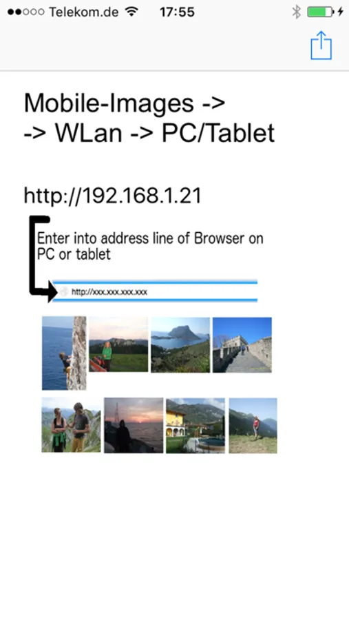 You want to see all the pictures stored on your mobile on a PC/Tablet? Without using a cable? This is possible with this app: BrowserMe. Just connect the mobile to the same wireless LAN network as your PC/Tablet and go ahead! You can call up the pictures on your mobile like a webpage.