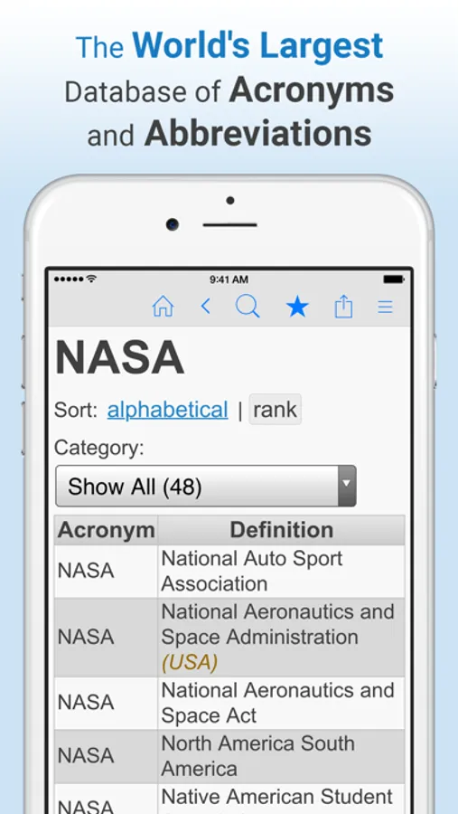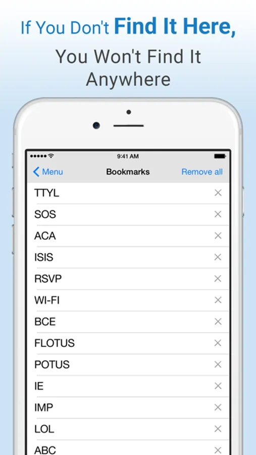 * Save an unlimited amount of acronyms in your bookmarks for easy reference.