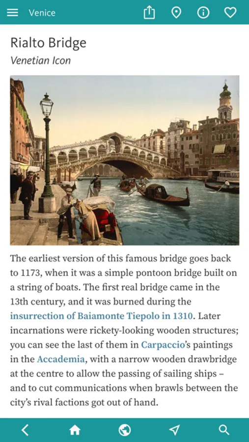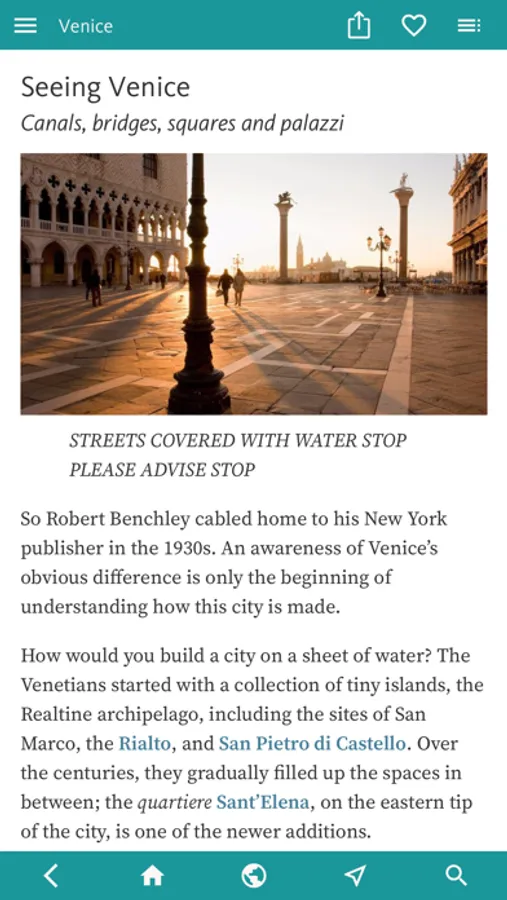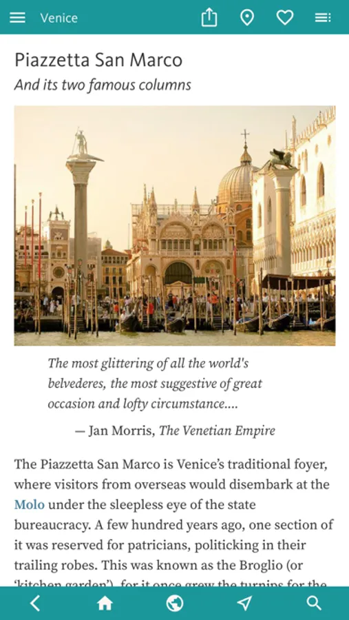 VENICE is the app that takes you deeper, with a definitive account of the city’s fabulous history, its culture and ceremony, its monuments and its art. We don’t do hotels and restaurants; instead, we offer a cultural companion that can enrich your visit like no other guide.