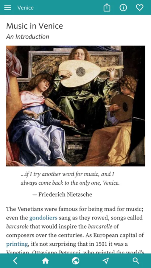 VENICE reveals every aspect of the Serenissima’s history, architecture, art, festivals, personalities and oddities, in over 500 in-depth articles covering everything from Venice's courtesan culture to its role in the invention of opera, from the secrets of the mosaics in the Basilica at Torcello to the story behind Harry's Bar.