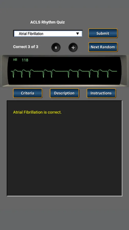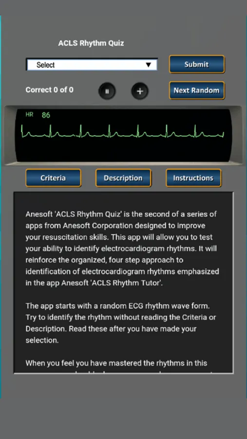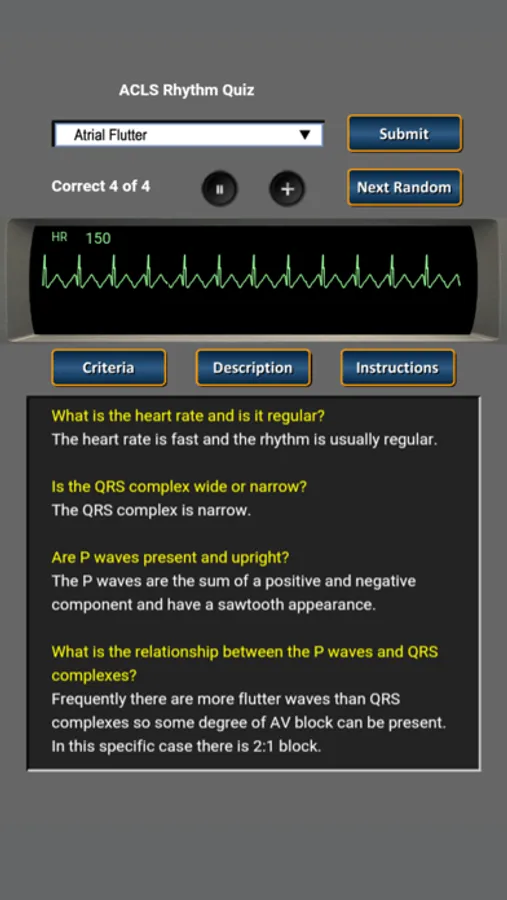 The app utilizes an organized four Criteria approach to identify the rhythms. You can also study the Description of the rhythm to review the electrophysiology. Use the same process to test yourself and review all the ECG rhythms.