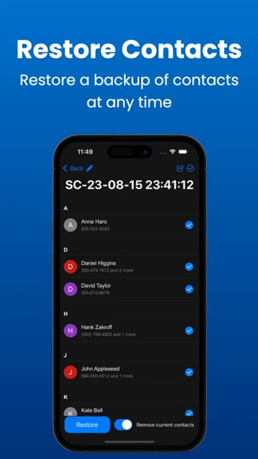 • Restore Contacts Quickly: Bring back contacts from a backup whenever you need them.