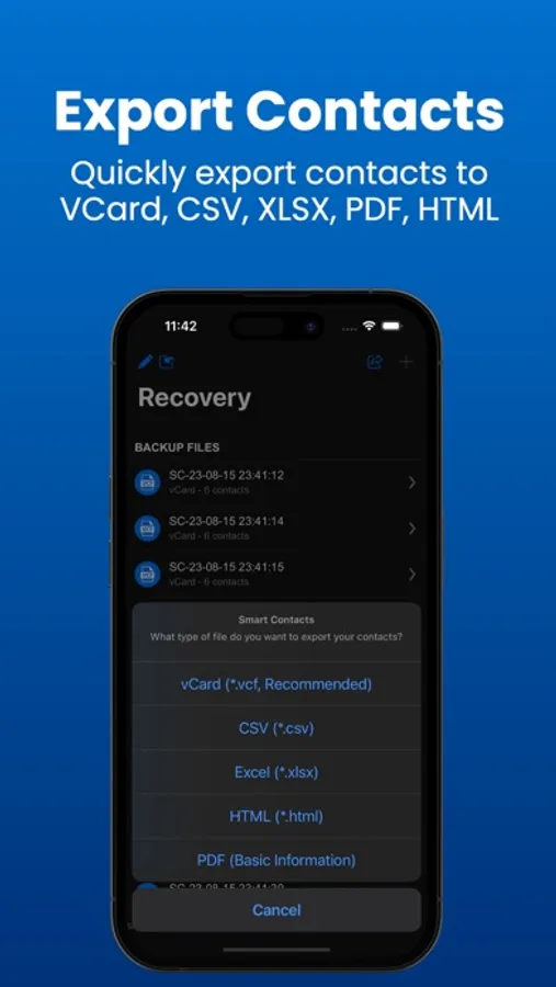 • Export Your Contacts: Export your contacts in various formats and share them via Email, Messages, and more.