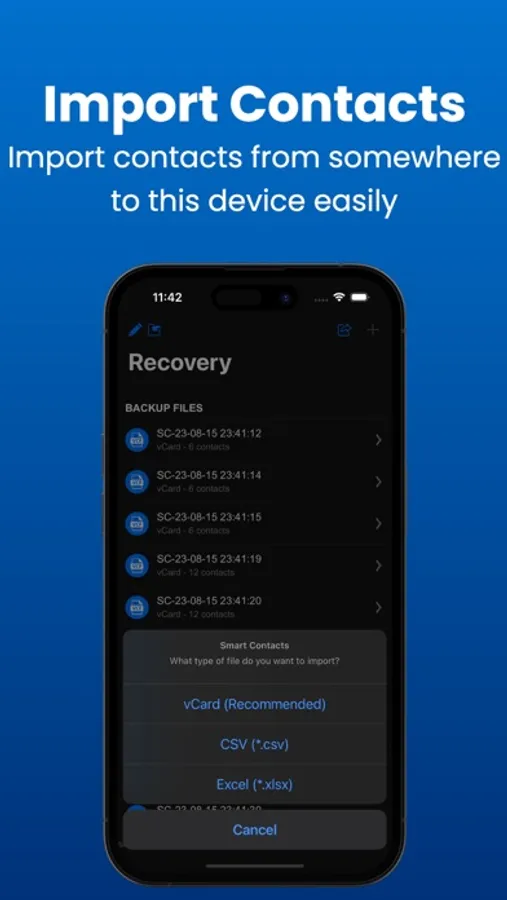 • Import Contacts Effortlessly: Bring in contacts from VCard, CSV, or XLSX files. Note: Only CSV or XLXS files created by this app or in the same format can be restored.