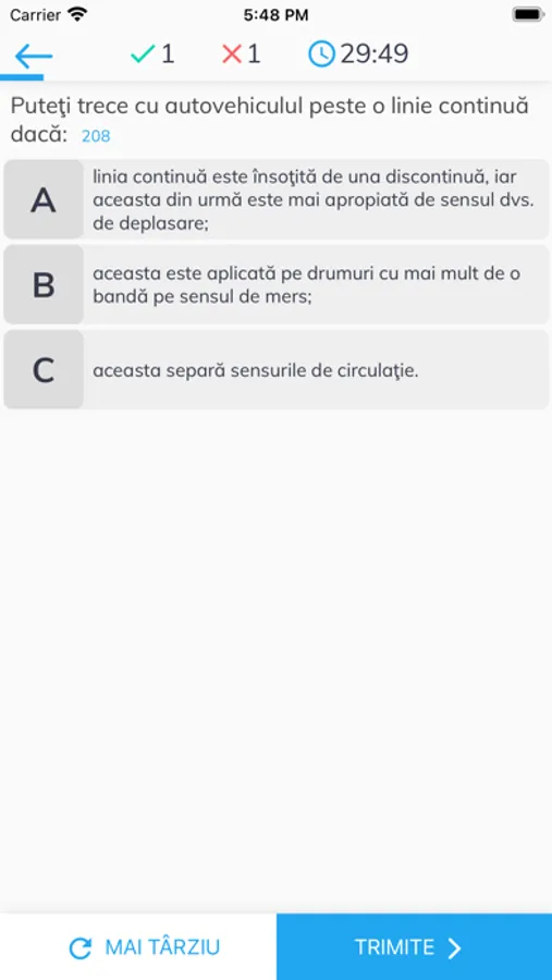 - Zilnic, primești întrebări din capitolele de legislație rutieră pe care încă nu le-ai rezolvat, pentru a te asigura că ai parcurs întreaga materie de la categoria aleasă și nu ai trecut cu vederea ceva.
