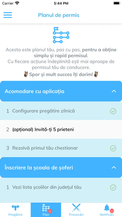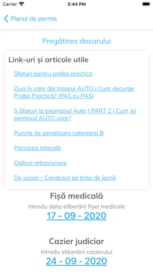 - Planul pentru permis - conține informațiile necesare, de la înscrierea la școala de șoferi, actele necesare pentru dosarul cursantului, la sfaturi pentru examenele auto.