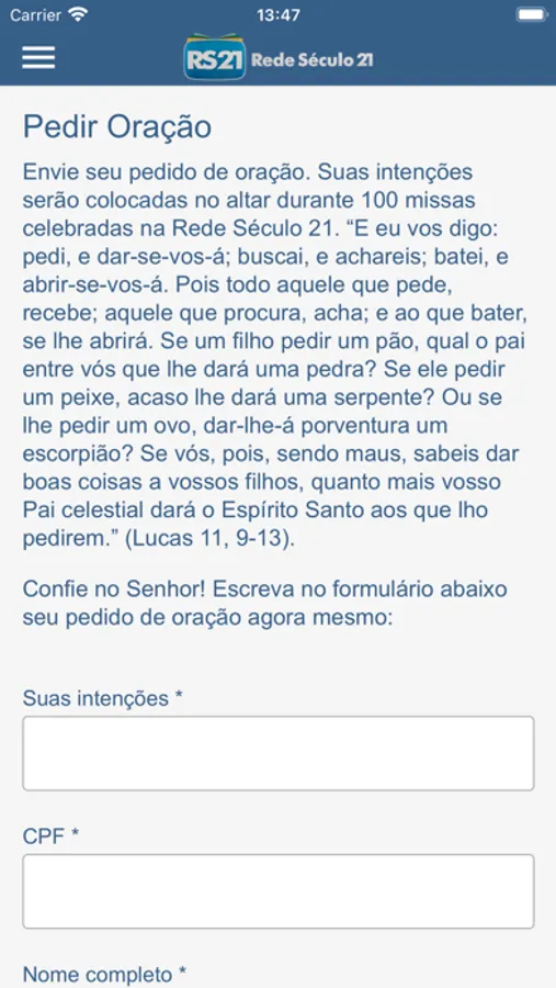 - Faça seu “pedido de oração” por meio do aplicativo. Seu pedido será colocado na intenção de 100 missas celebradas na Associação do Senhor Jesus pelo Pe. Eduardo Dougherty,sj, e demais sacerdotes colaboradores desta Obra.