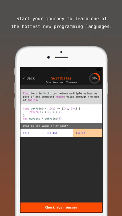 Learn how to code in Swift while you're on the go! Whether you're a complete beginner or experienced developer looking to learn one of the hottest new programming languages, SwiftBites will teach you the basics of Swift and get you started on this awesome learning adventure. You'll even get awarded a nifty little certificate for completing the entire mini-course! :)