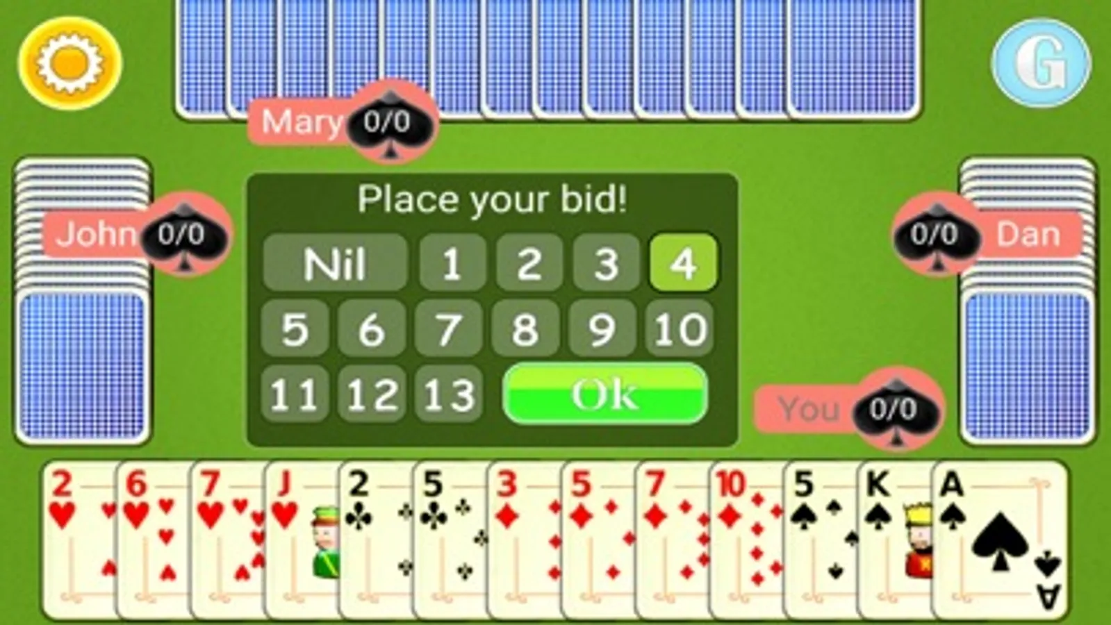 Spades Mobile is a very popular trick-taking card game. The goal of the game is to take at least the number of tricks that were bid before each hand. The game is played in teams and spades are the trump. Your partner sits in front of you and the deals are played clockwise. If you and your partner win as many tricks as the bid you made together, your team gains 10 points for each trick. If your team wins fewer tricks than the bid, you lose 10 points for each bid trick. In order to win you need to make as many points as possible.