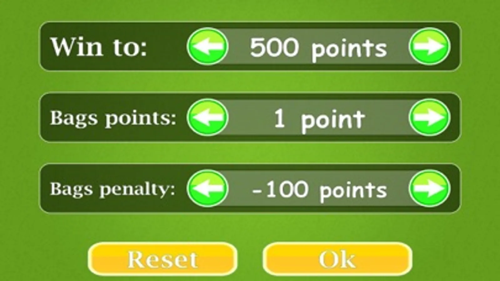 - If you and your partner take more tricks than the bid, each additional trick counts as a bag. Per default, for each bag you get 1 point. For every 10 bags you collect, per default you get a 100 points penalty.